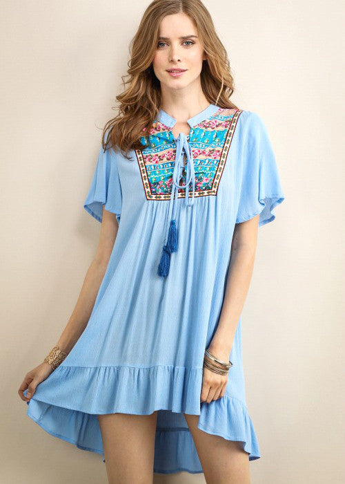 This darling dress that is inspired by the nomad culture, full of color and a myriad of details. Featuring a front v-neck, 3/4 sleeves and a gypsy-like free fit, this dress is timeless and heartwarmingly charming.